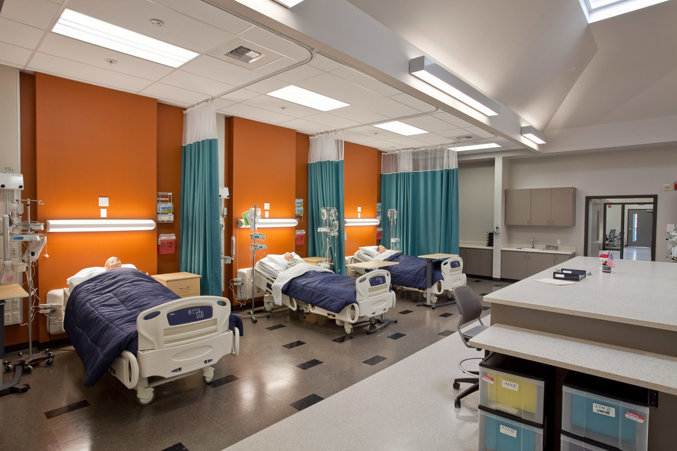 Nursing Program students enjoy the new 7 bed nursing labs with attached classrooms, a hospital skills lab simulation center that is designed to create a controlled, immersed hospital experience. The simulation suites include labor and delivery rooms, medical/surgical ICU, emergency room, triage, and a nursing and medication station.